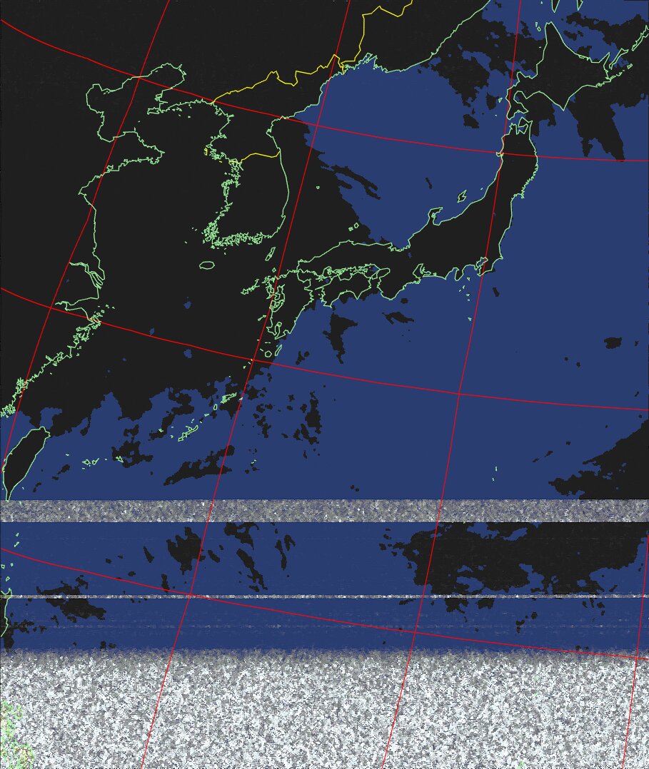 | NOAA15 07:46:22~08:01:24 進行方向(北から南) 最大昇角(67°) 方角(西) |
