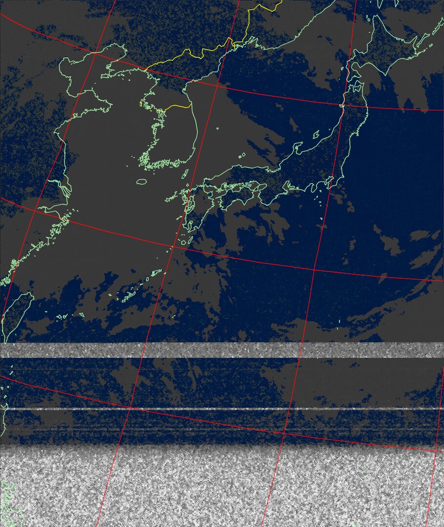 | NOAA15 19:01:59~19:17:04 進行方向(南から北) 最大昇角(64°) 方角(西) |