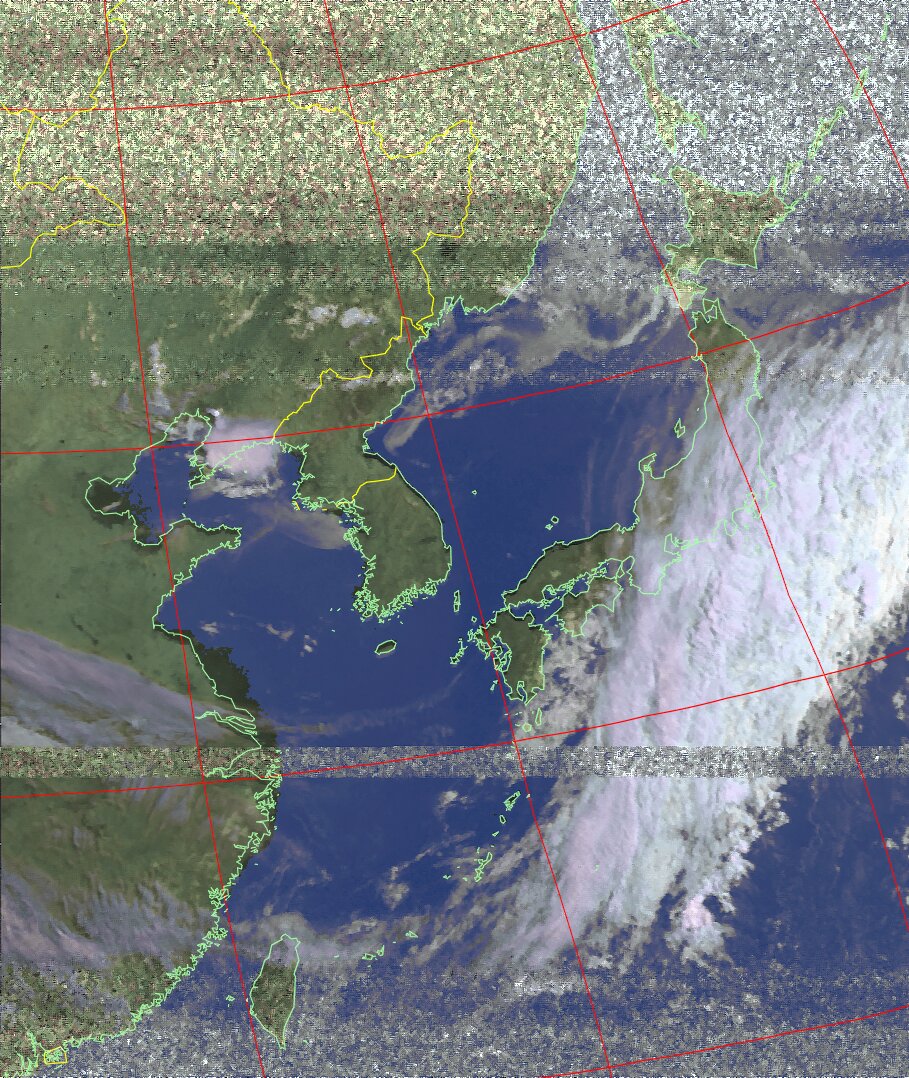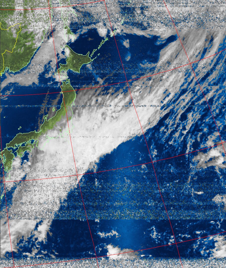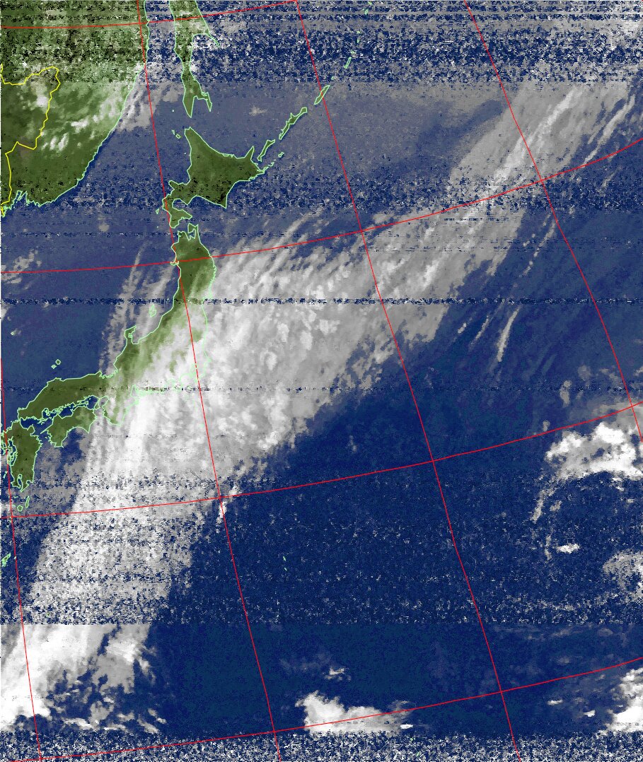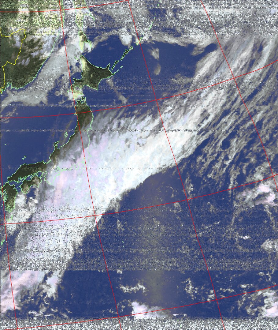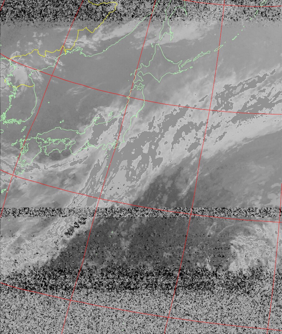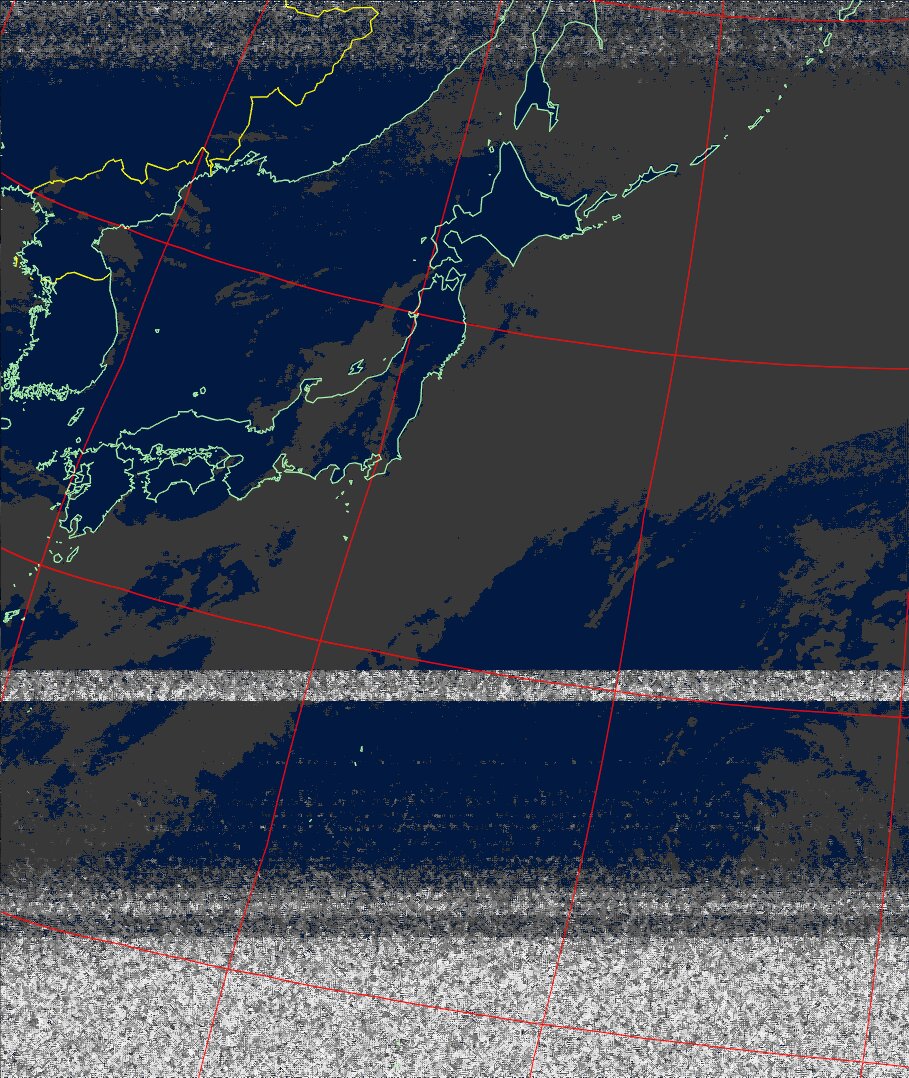 | NOAA19 10:25:39~10:41:15 進行方向(北から南) 最大昇角(65°) 方角(西) |