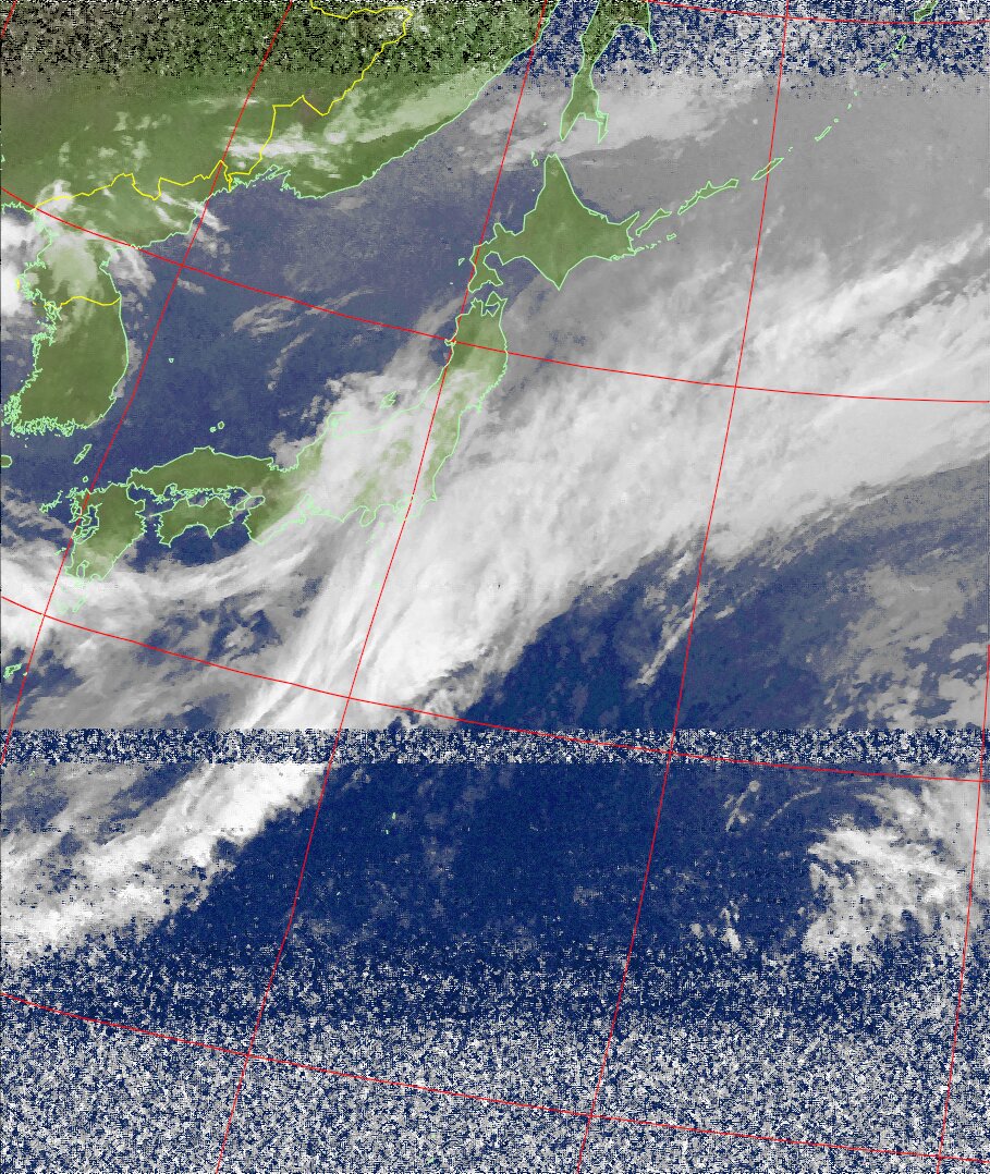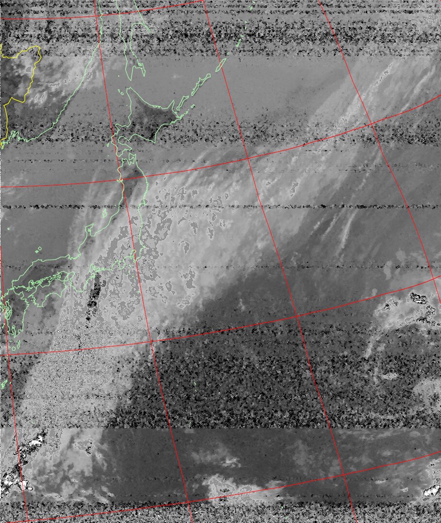 | NOAA18 10:20:46~10:35:27 進行方向(北から南) 最大昇角(29°) 方角(東) |