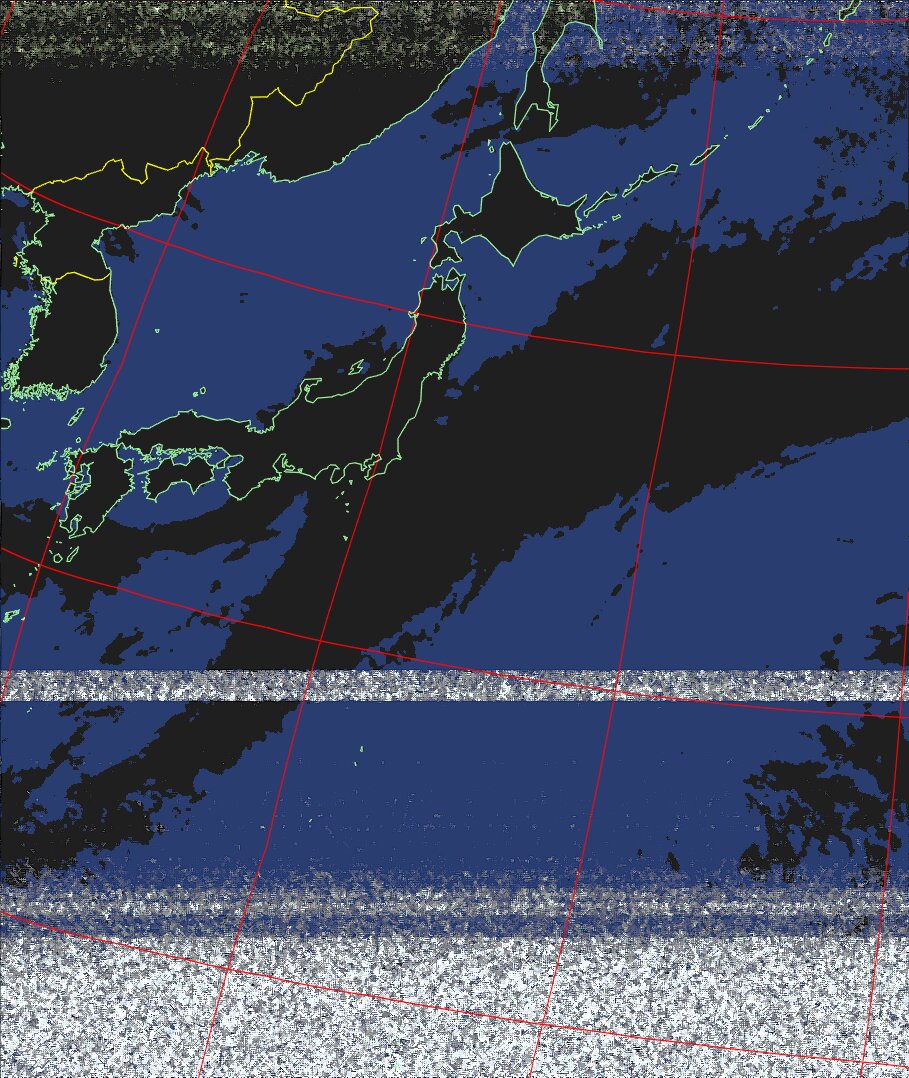 | NOAA19 21:47:49~22:03:12 進行方向(南から北) 最大昇角(51°) 方角(西) |