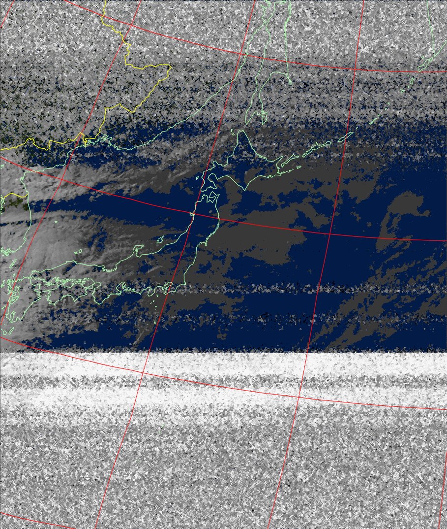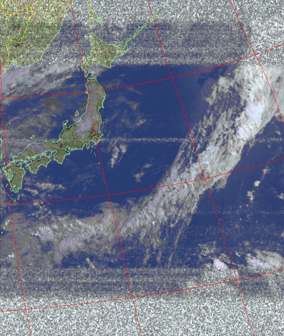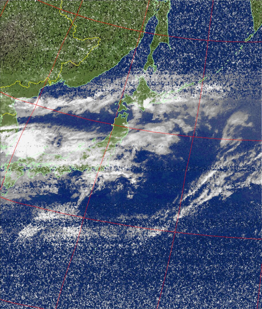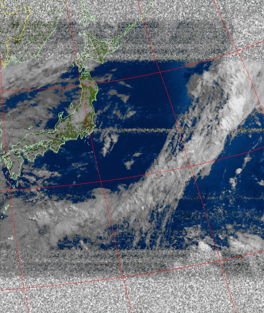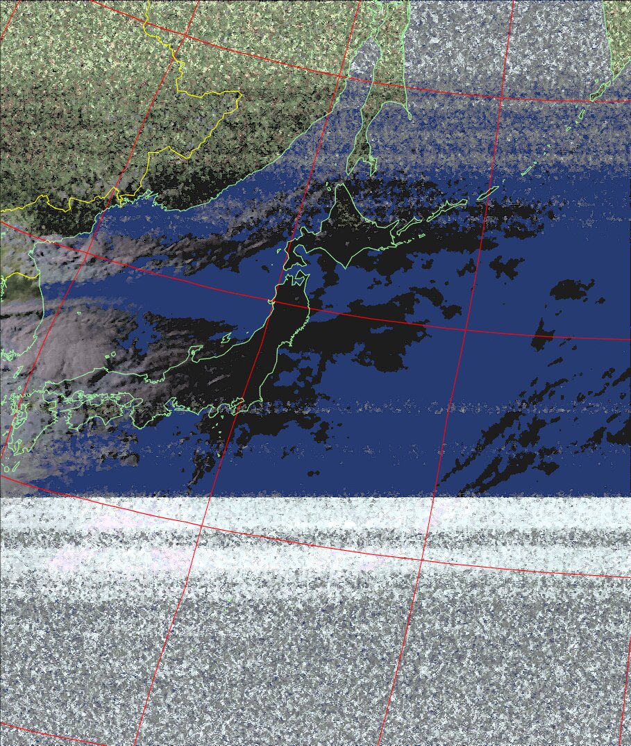 | NOAA19 09:59:36~10:15:21 進行方向(北から南) 最大昇角(69°) 方角(東) |