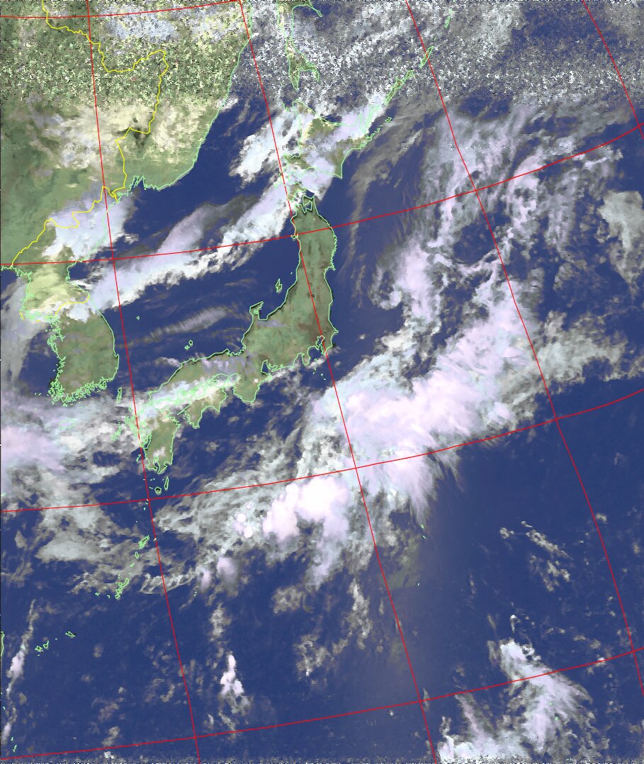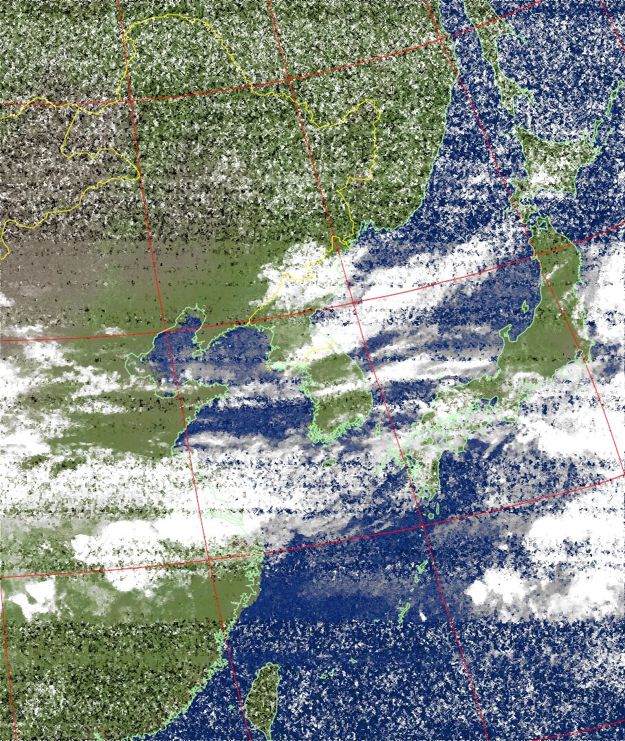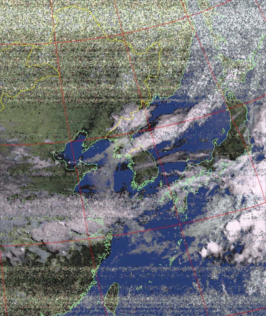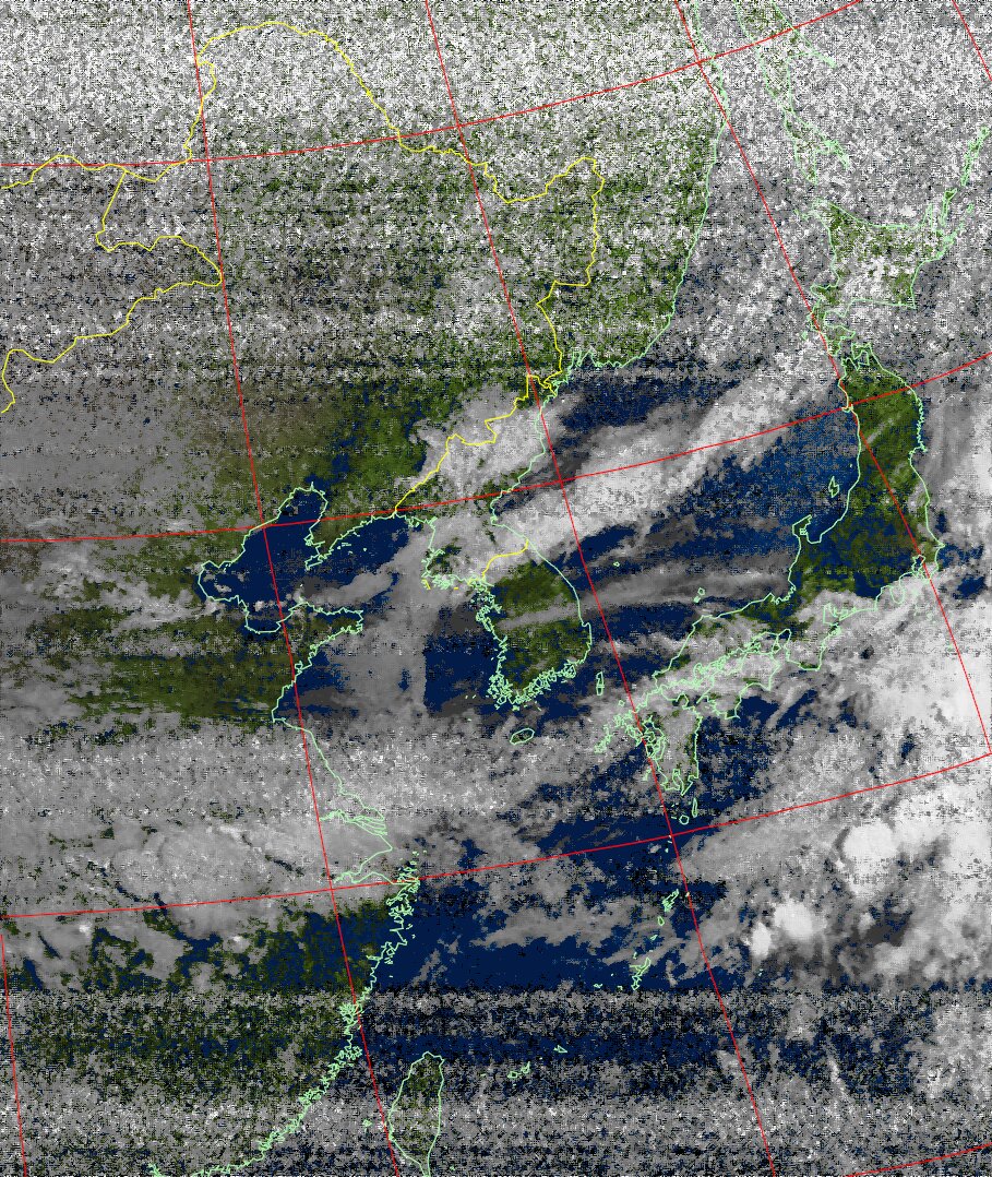 | NOAA19 09:47:00~10:02:36 進行方向(北から南) 最大昇角(53°) 方角(東) |