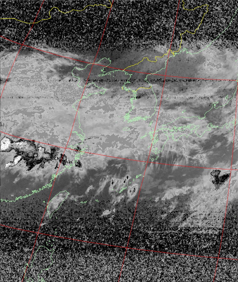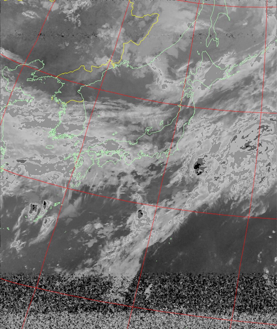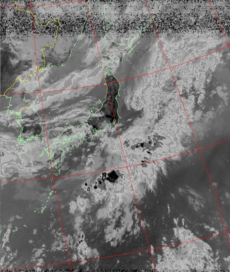| NOAA15 08:01:40~08:16:29 進行方向(北から南) 最大昇角(46°) 方角(西) |