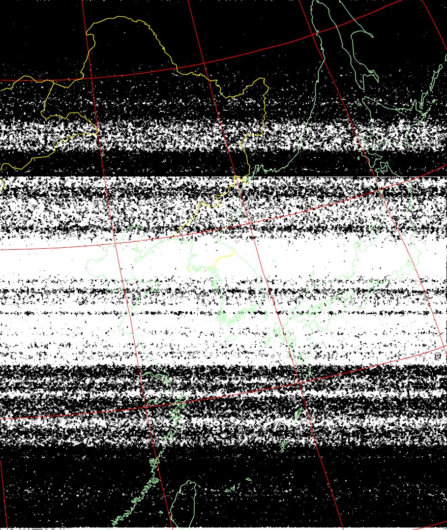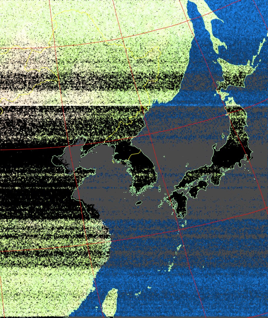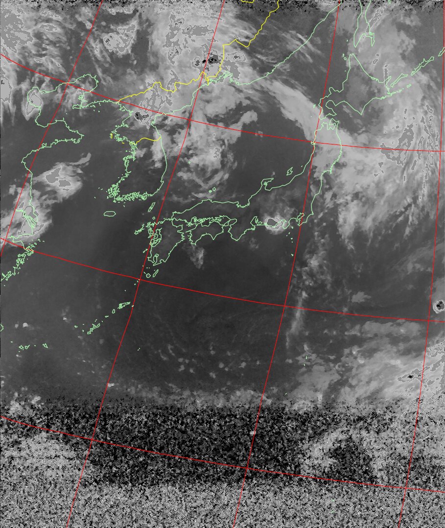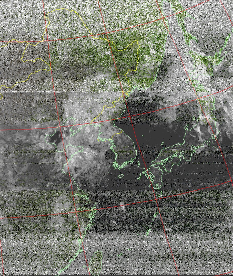 NOAA19 09:57:23~10:13:08 進行方向(北から南) 最大昇角(64°) 方角(東)