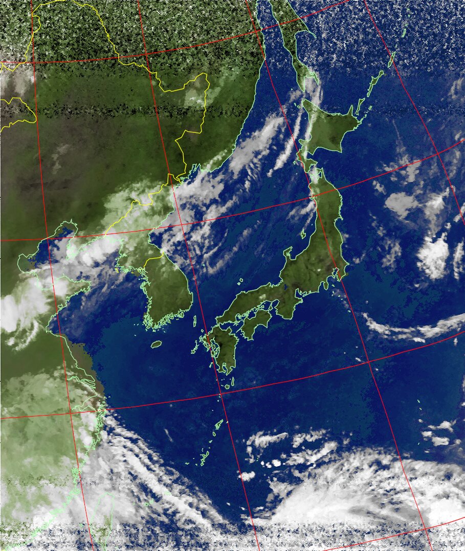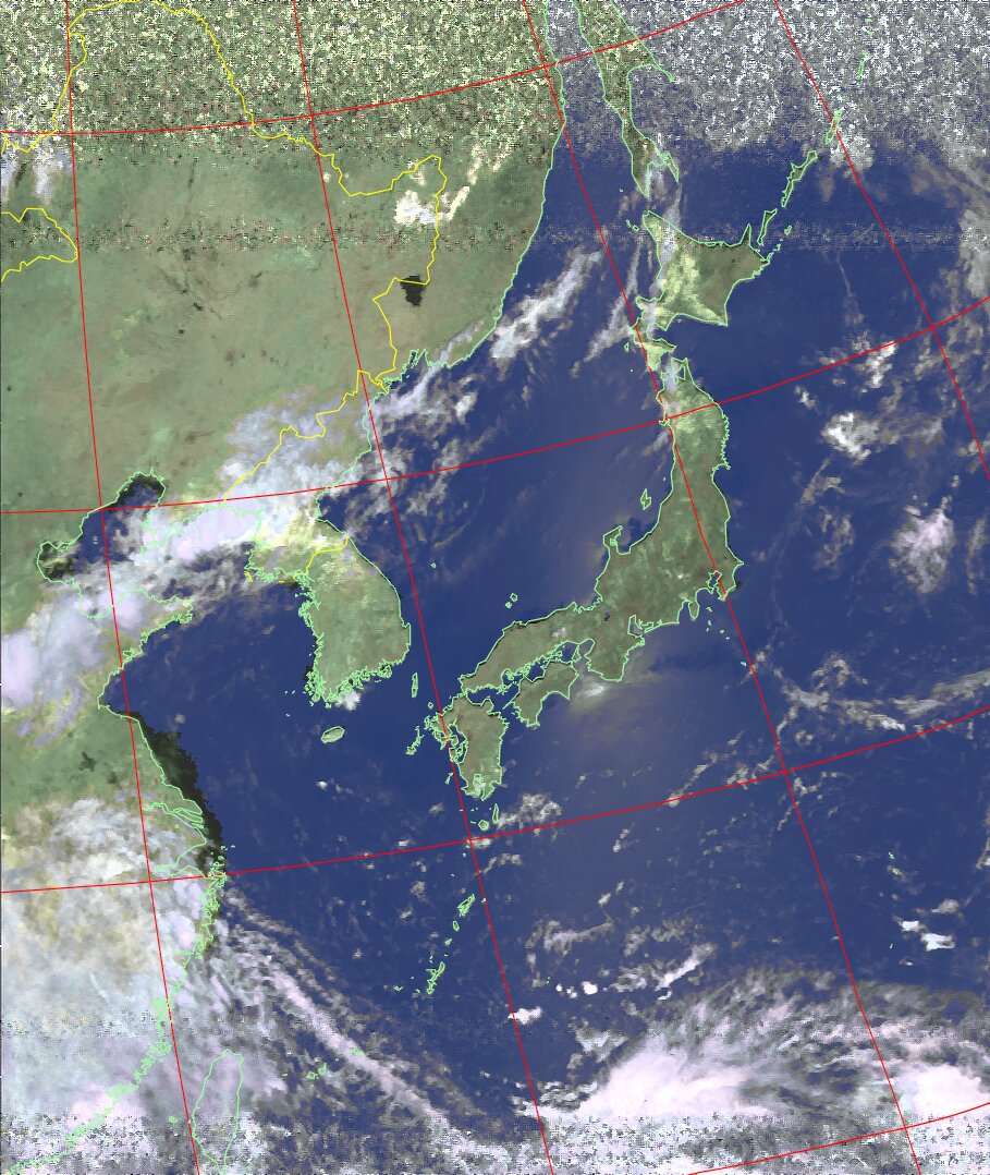 NOAA19 21:42:15~21:57:59 進行方向(南から北) 最大昇角(64°) 方角(西)