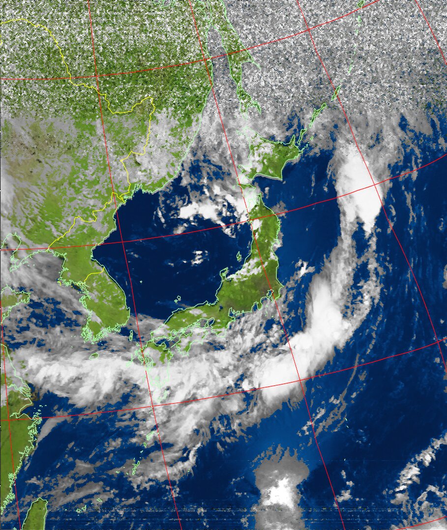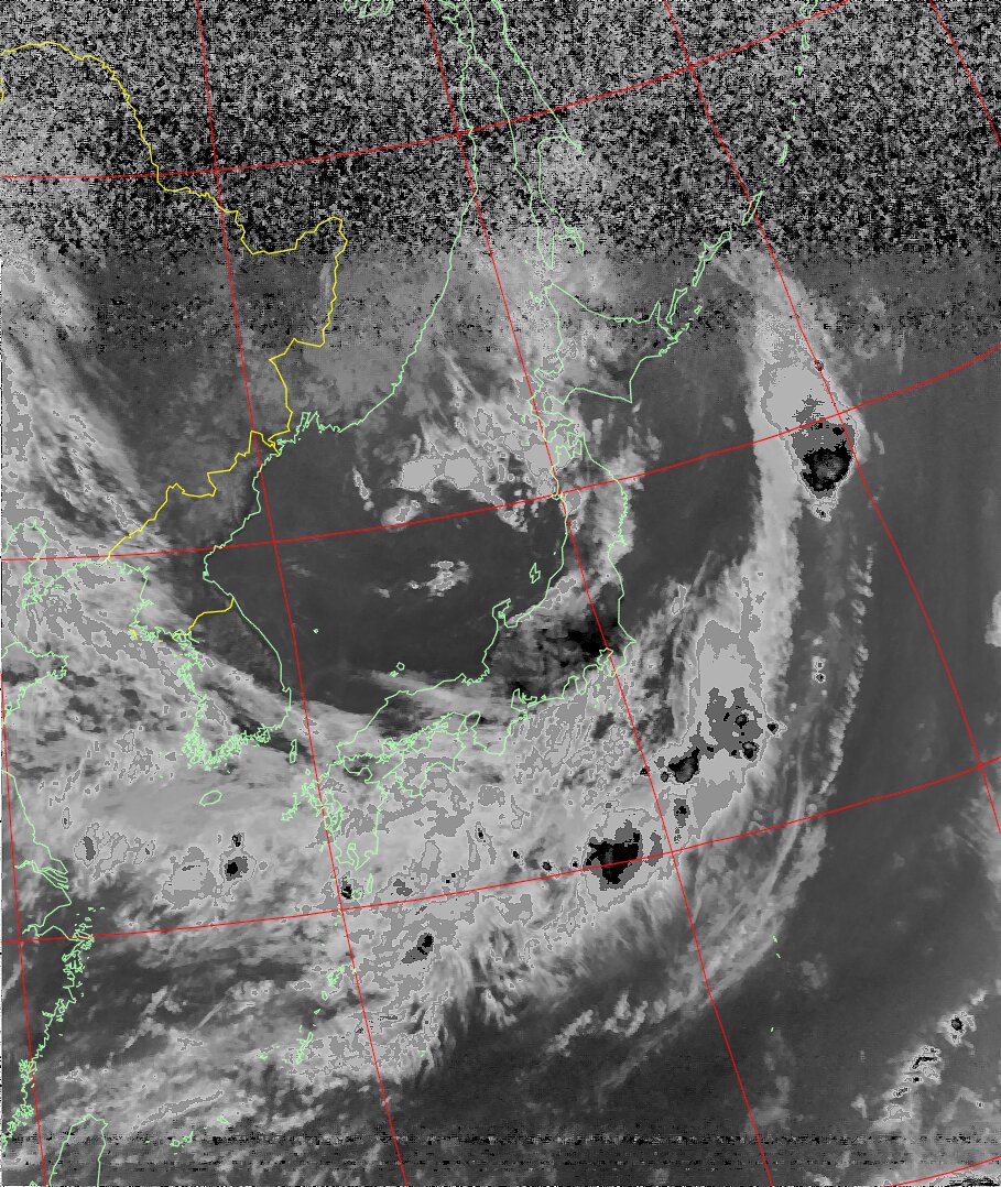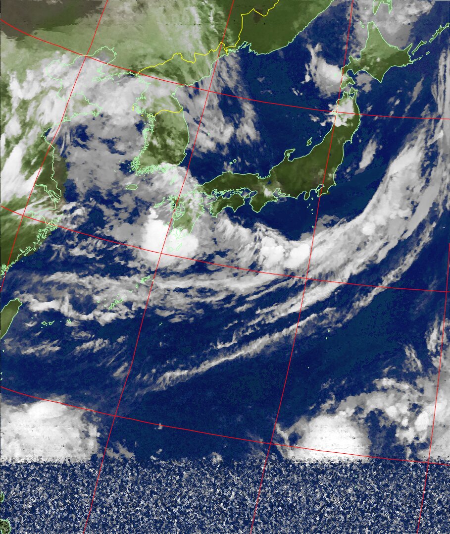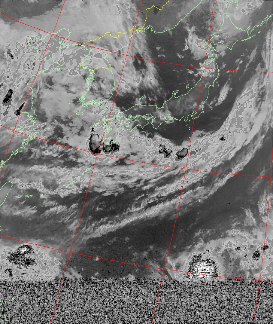 NOAA19 21:27:47~21:43:35 進行方向(南から北) 最大昇角(89°) 方角(西)