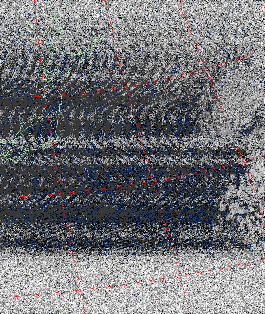 | NOAA15 06:50:57~07:04:34 進行方向(北から南) 最大昇角(21°) 方角(東) |