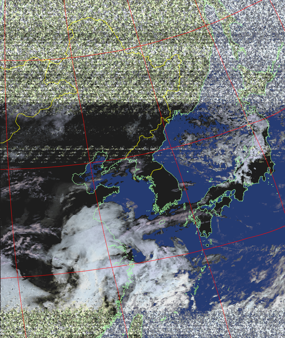 | NOAA19 19:48:59~20:04:40 進行方向(南から北) 最大昇角(84°) 方角(西) |