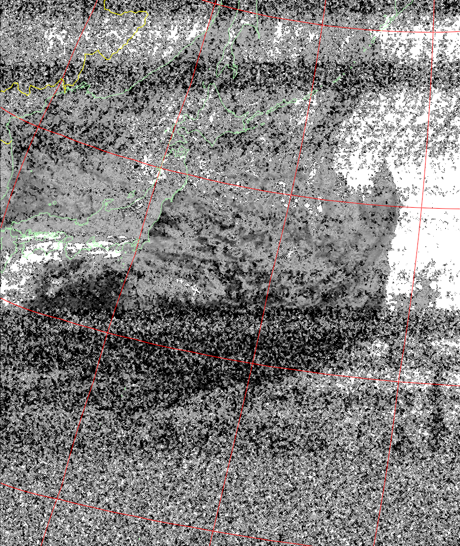 | NOAA18 21:01:56~21:16:33 進行方向(南から北) 最大昇角(27°) 方角(東) |