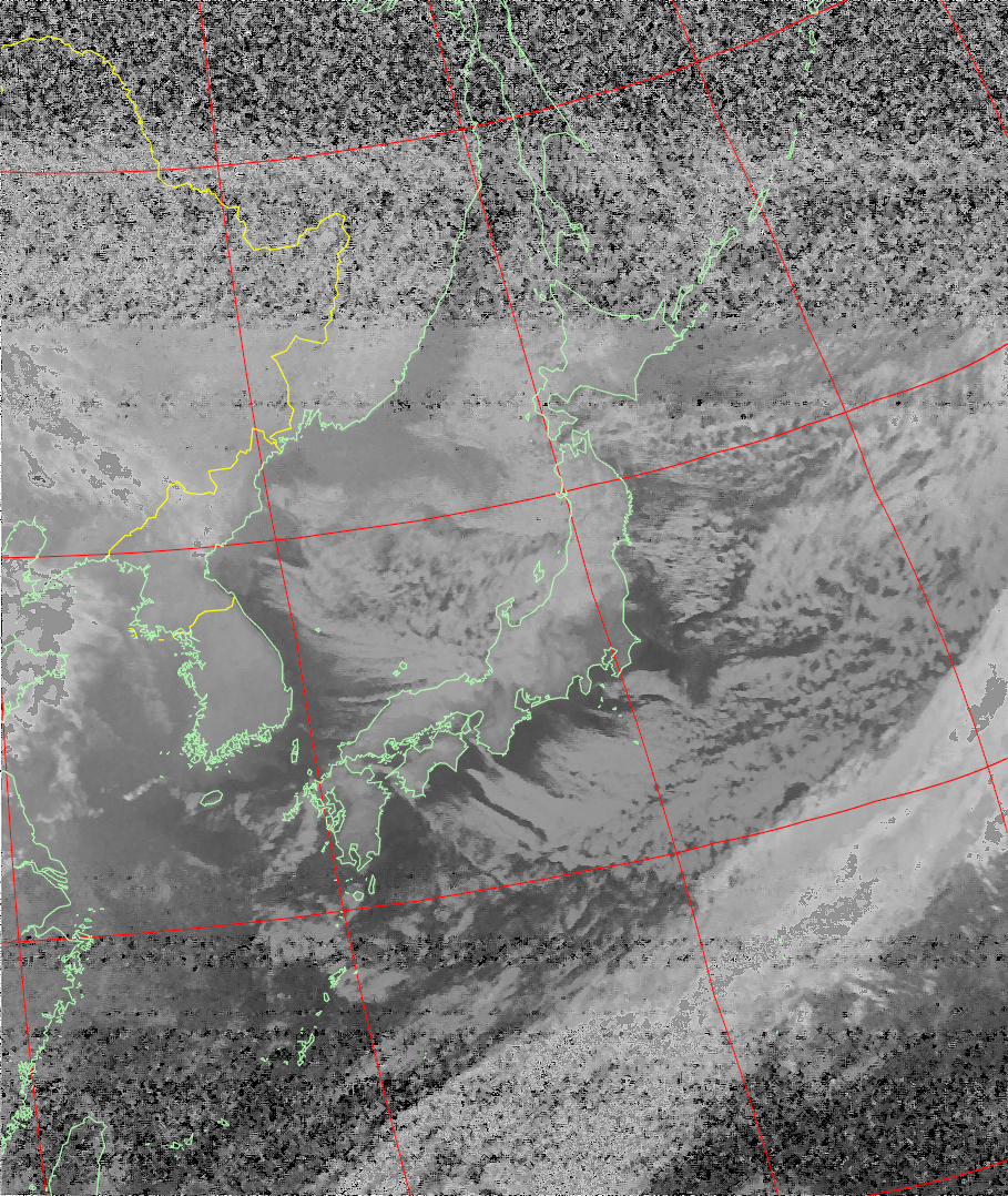 | NOAA19 09:24:48~09:39:36 進行方向(北から南) 最大昇角(31°) 方角(西) |