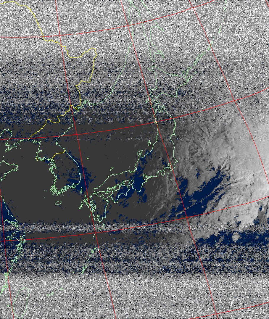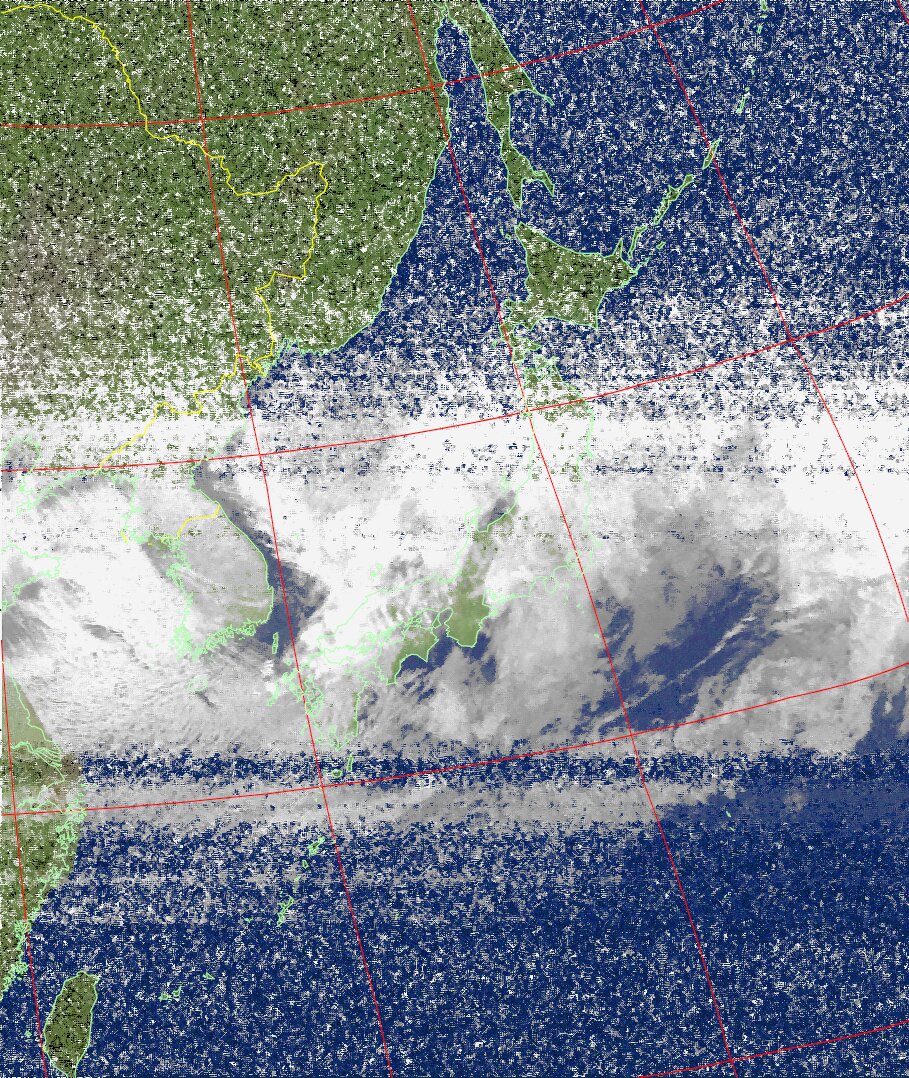 | NOAA18 11:54:11~12:07:59 進行方向(北から南) 最大昇角(21°) 方角(西) |