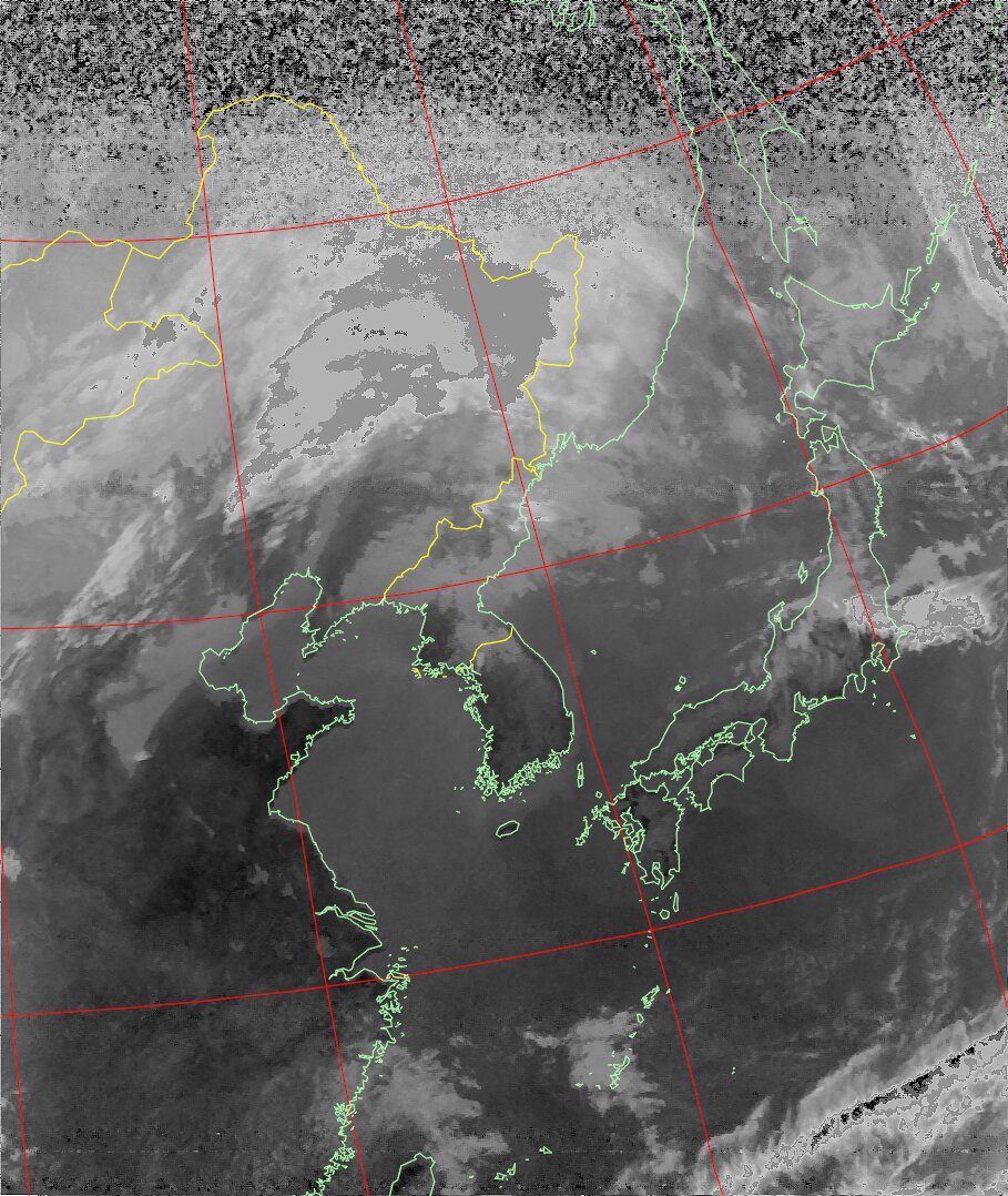 | NOAA15 07:47:35~08:02:50 進行方向(北から南) 最大昇角(88°) 方角(東) |