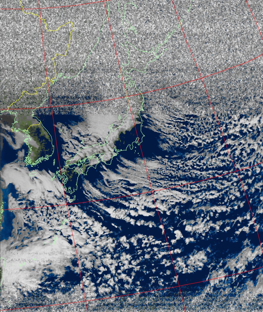 | NOAA18 22:01:10~22:16:47 進行方向(南から北) 最大昇角(70°) 方角(東) |