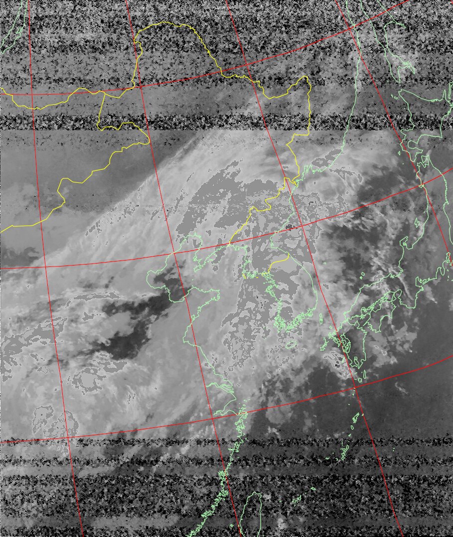 | NOAA19 20:16:31~20:31:18 進行方向(南から北) 最大昇角(32°) 方角(東) |