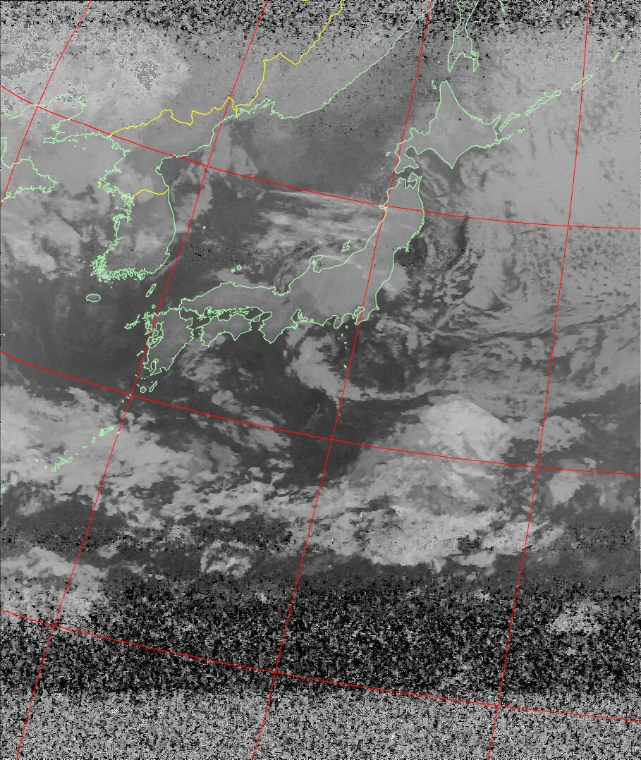 | NOAA19 09:23:29~09:38:53 進行方向(北から南) 最大昇角(46°) 方角(東) |