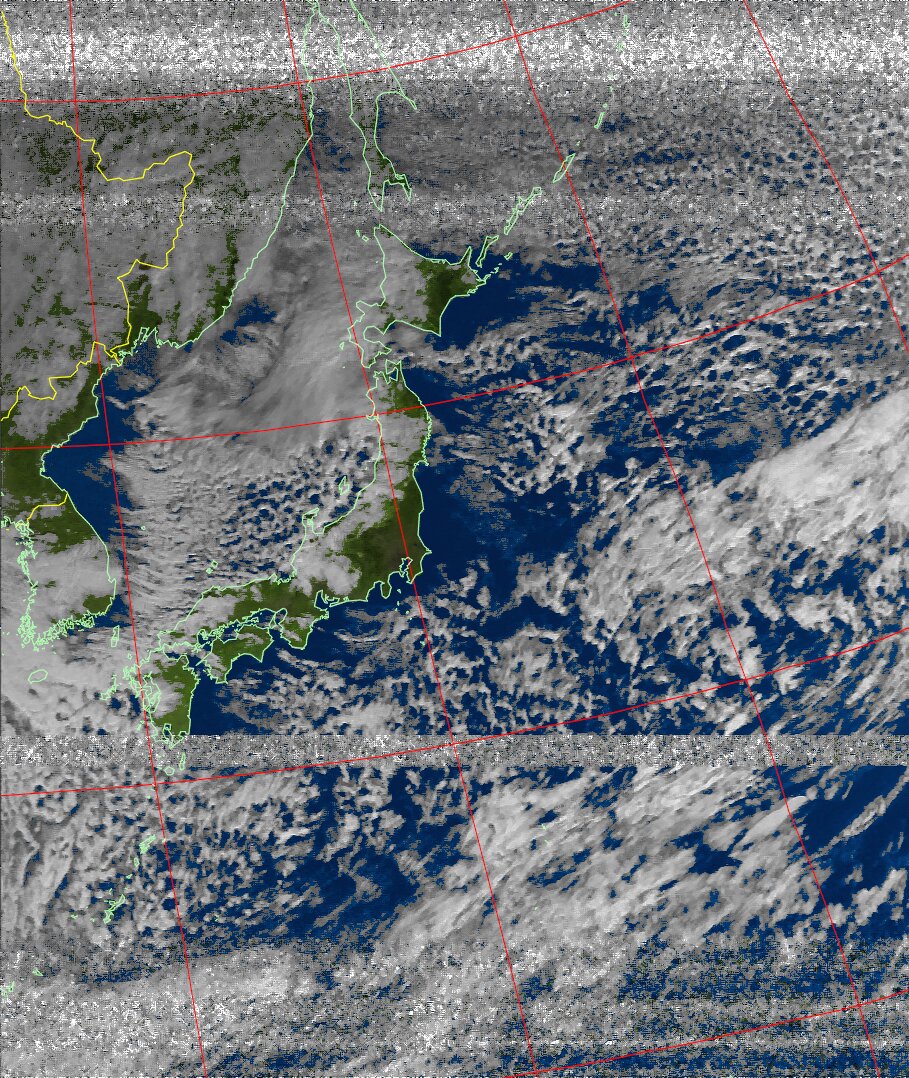 | NOAA18 11:38:31~11:53:44 進行方向(北から南) 最大昇角(46°) 方角(西) |