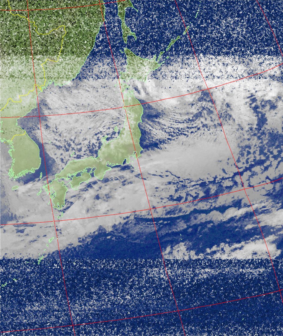 | NOAA18 11:12:51~11:28:28 進行方向(北から南) 最大昇角(83°) 方角(西) |