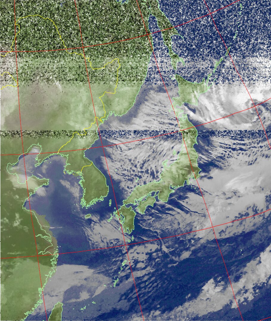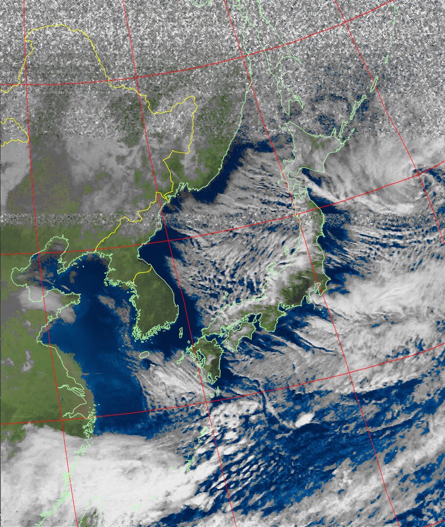 | NOAA19 09:14:58~09:29:57 進行方向(北から南) 最大昇角(31°) 方角(東) |