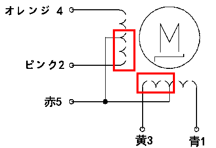 以下のように2相(青1ー黄3,オレンジ4ーピンク2)の間に1本共通の線(赤5)が配線されている